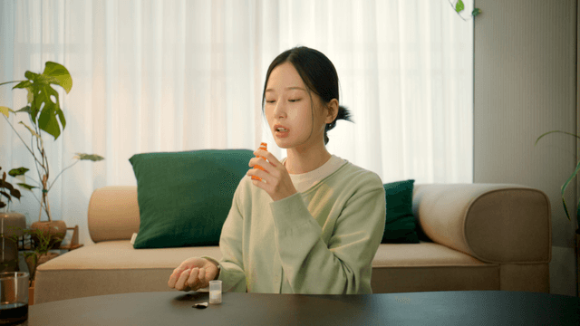 Woman taking liquid vitamin supplement in living room