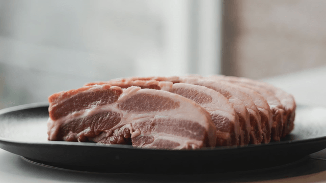 Slices of raw pork belly on a plate