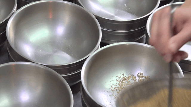 Pouring soybeans into a blue bowl