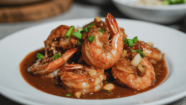Chili shrimp in rich sauce garnished with green onions