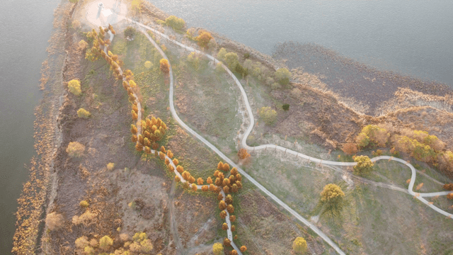 A scenic riverside park with walking paths
