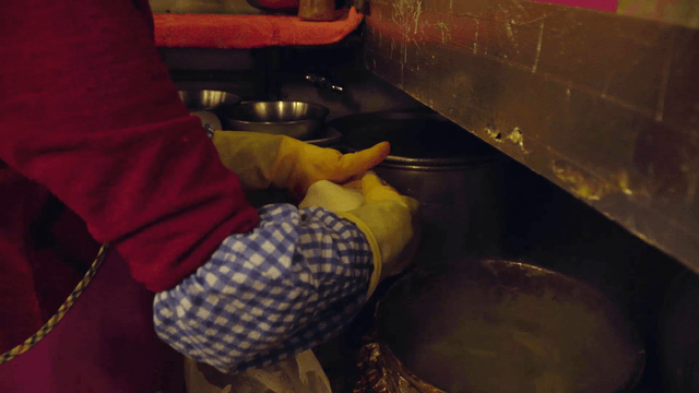 Hand preparing freshly made noodles in a traditional kitchen setting
