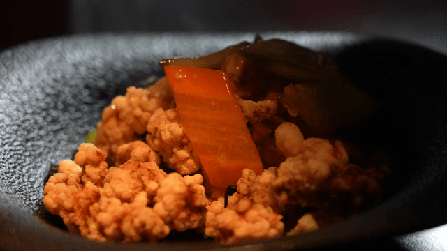 Crispy black garlic tangsuyuk on black plate
