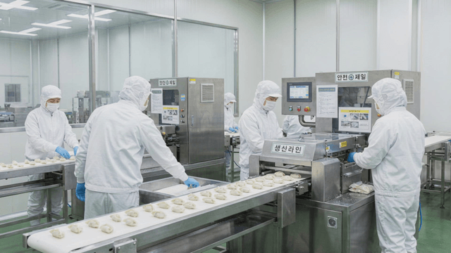 Workers making godeulppaegi kimchi on stainless steel worktop in a food factory