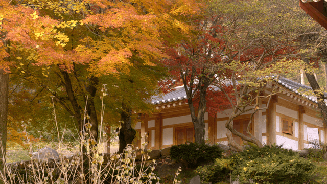 Traditional Korean house surrounded by autumn trees