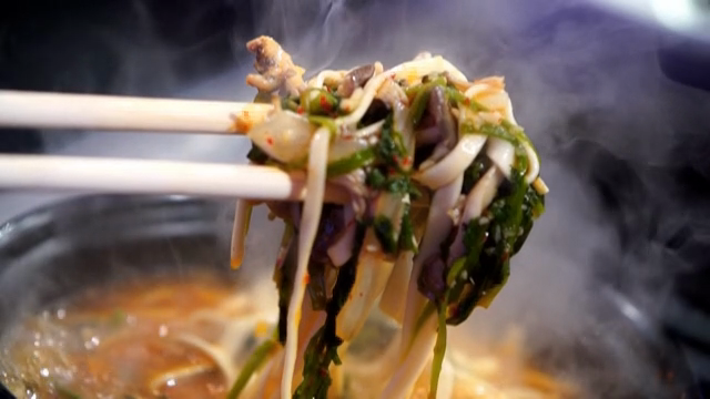 Pork backbone stew with perilla leaves and enoki mushrooms