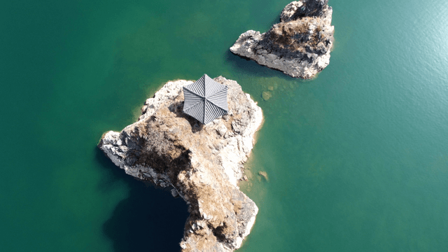 Traditional Korean pavilion on a rocky cliff next to a green river