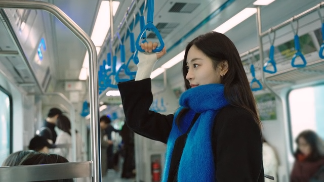 Back of a woman standing in a subway car with a view of the road beyond the window