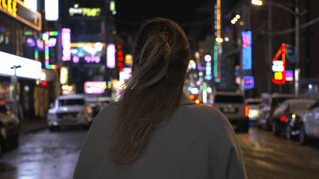 Back view of a woman walking through a city street at night