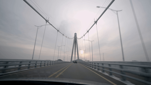 Driving on a bridge on a cloudy day