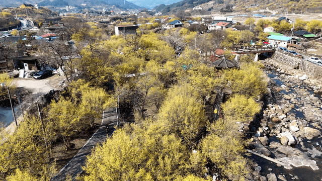 Rural village surrounded by fields and yellow cornelian cherry trees