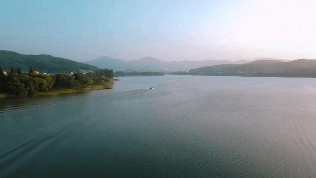Tranquil lake with boats and distant villages