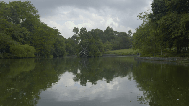 Calm Lake Surrounded by Lush Green Hills with Trees