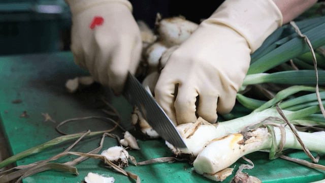 Cutting Green Onions with a Kitchen Knife on a Cutting Board