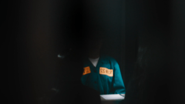 Prisoner giving statement in interrogation room and investigator questioning him.