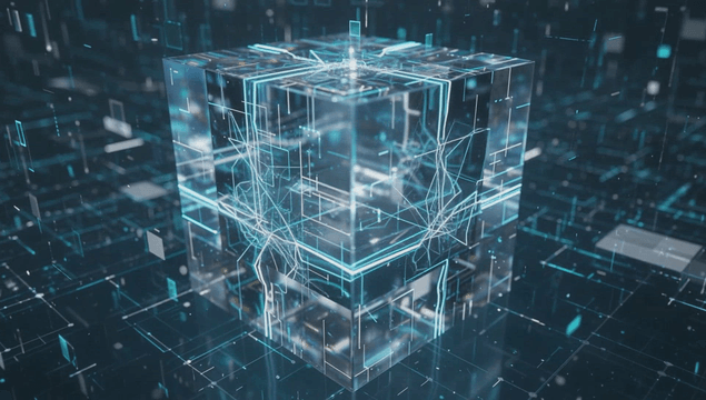 Glowing digital cube in a virtual space