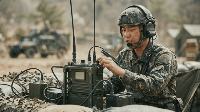Soldier operating communication equipment in field