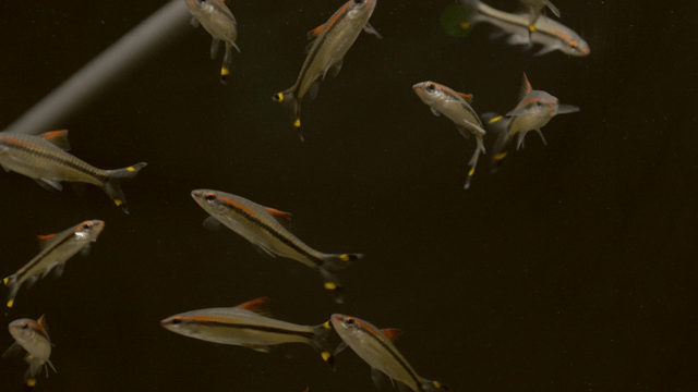 Small fish swimming in a clear aquarium