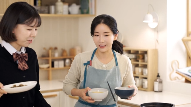 Daughter tasting soup her mother cooked in cozy kitchen.