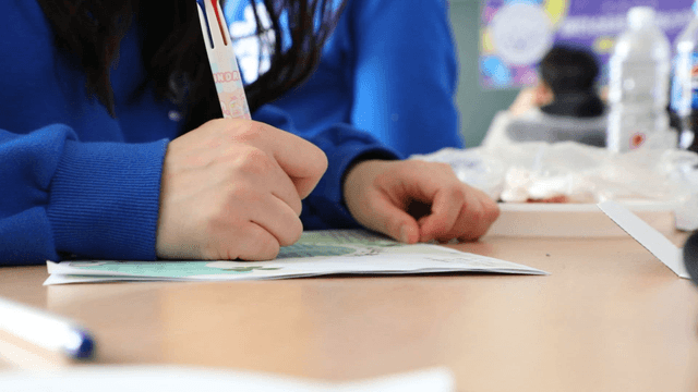 Student focused on writing in a classroom