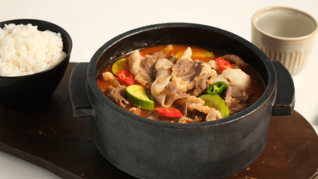 Soy Bean Paste Stew in Earthen Pot Placed on a Wooden Table
