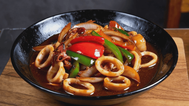 Spicy stir-fried squid on a plate