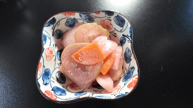 Pickled radish piece held with chopsticks