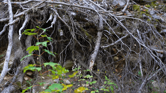 Collapsed earth exposing tree roots and house