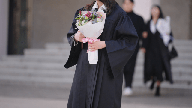 Back view of graduates holding bouquets at graduation ceremony
