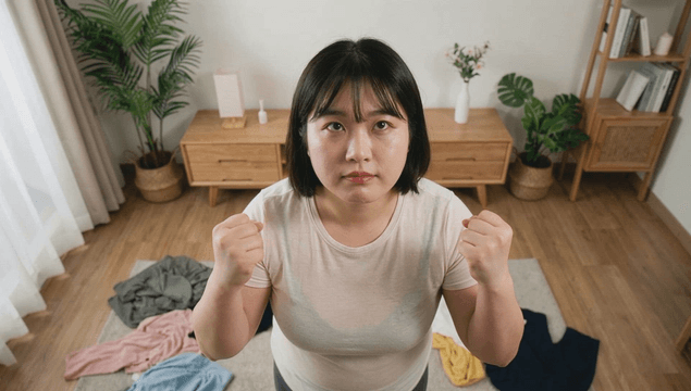 Fat woman sitting on floor with determination