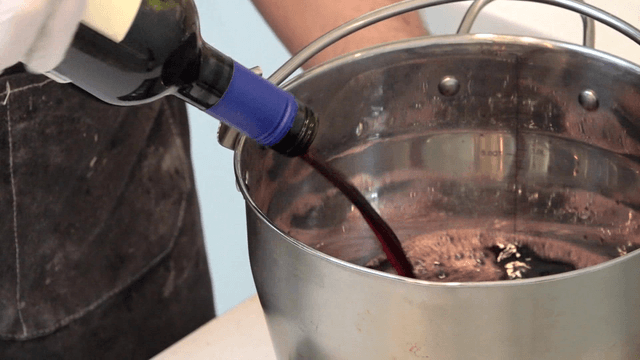 Red wine bottle poured into large pot