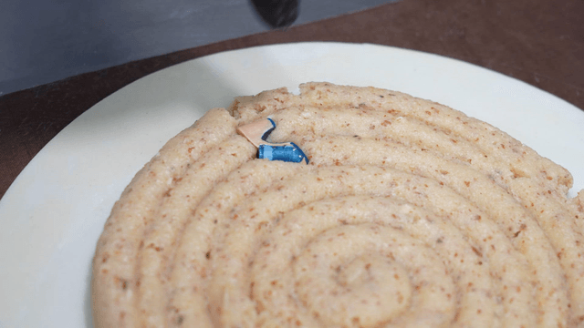 Hands feeding dough into dumpling wrapper machine in the kitchen