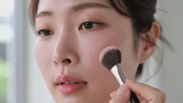 Makeup brush applying pink blush