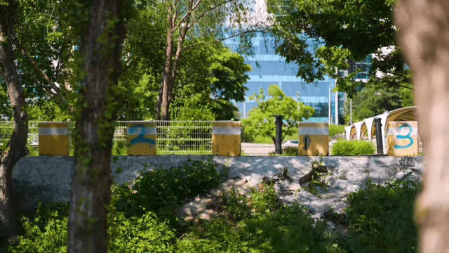 Blue concrete blocks in a green park