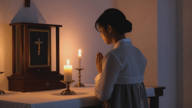Middle-aged woman praying in a mountain temple wearing traditional hanbok
