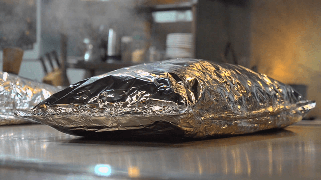 Meal wrapped in steaming foil on griddle in kitchen