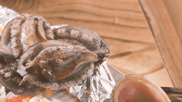 Appetizing butter-grilled abalone plated on a plate with tongs