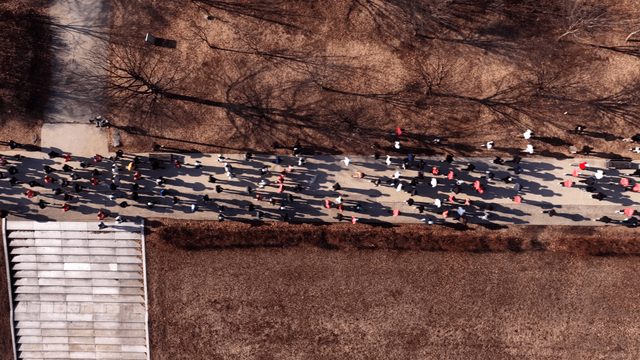 Marathon runners running along a tree-lined path
