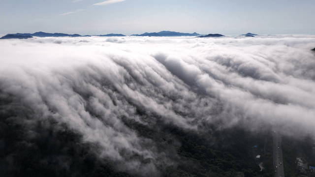 Clouds cascading over a forested mountain