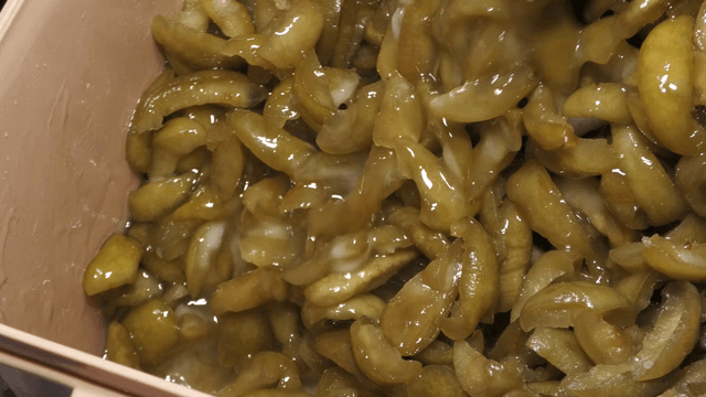 Cross-section of fried chili peppers cut with gloved hands