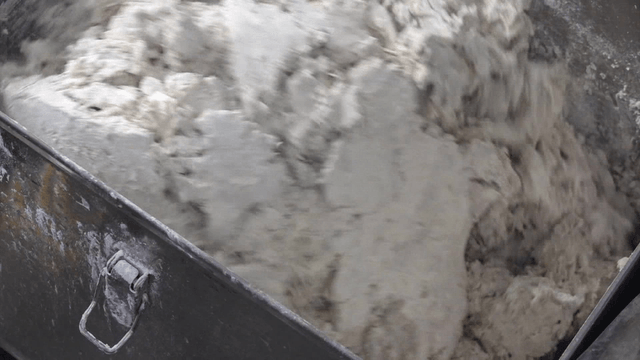 Chef mixing finely crushed ice with minced meat in industrial mixer