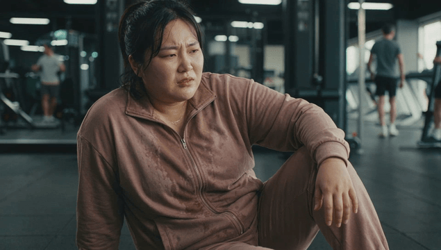 Obese woman resting after working out at gym