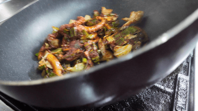 Cooking stir-fried vegetables and meat in a frying pan indoors