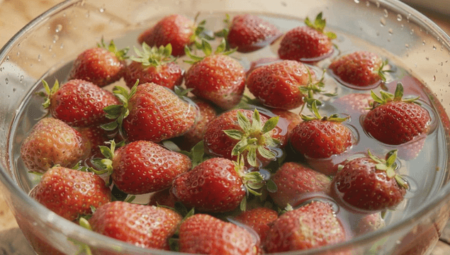 Strawberries soaking in a glass bowl