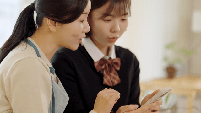 Mother looking at her daughter using her smartphone with pitiful expression.