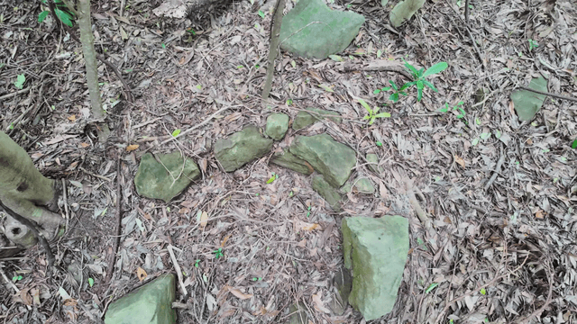 Feet lying next to piled rocks and fallen leaves on a rainy day