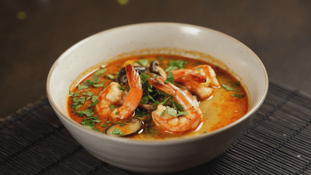 Bowl of spicy shrimp Tom Yum soup with herbs