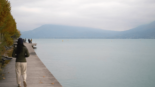 Serene Waterfront Walkway Amidst Autumn Foliage