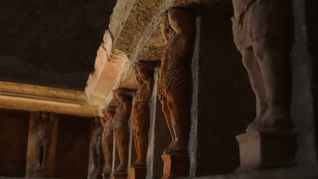 Ancient stone sculpture in a dimly lit cave