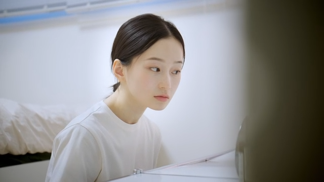 Woman carefully applying mascara to her lashes with a mirror indoors